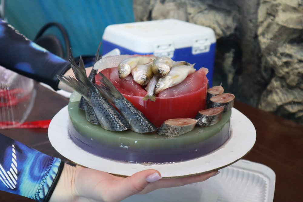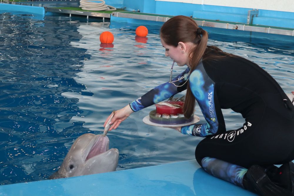 Годовалая Дея получила поздравления от тренеров. Специально для этого праздничного события был изготовлен двухъярусный торт из желе и сельди, которую так любят белухи. Руководитель службы по работе с морскими млекопитающими Антон Брыков рассказал, что "любая жирненькая рыбка придется по вкусу нашим подопечным, поэтому я уверен, что торт будет съеден полностью".