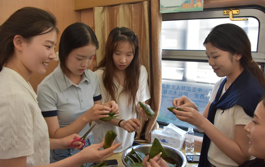 30 мая 2025 года, на международном туристическом поезде Китай-Центральная Азия пассажиры делают "цзунцзы" - традиционное кушанье из клейкого риса с разными начинками, завернутое в бамбуковые или тростниковые листья. /Фото: Синьхуа/