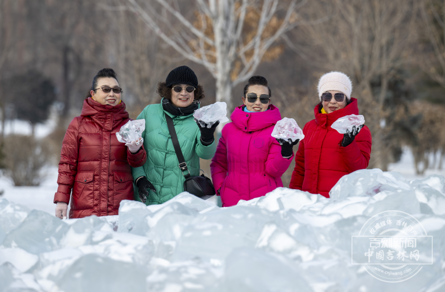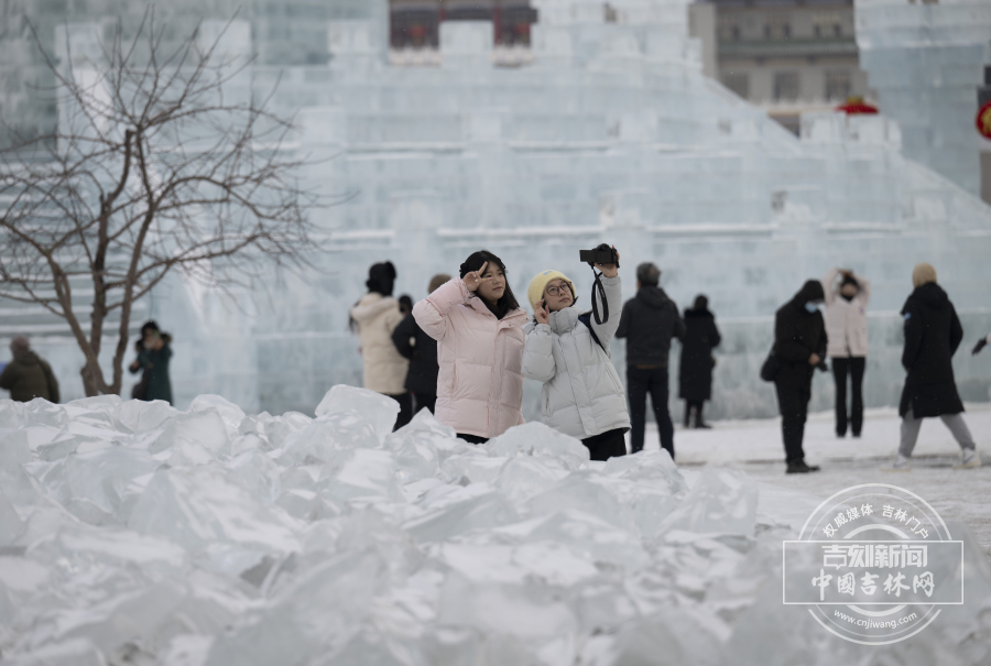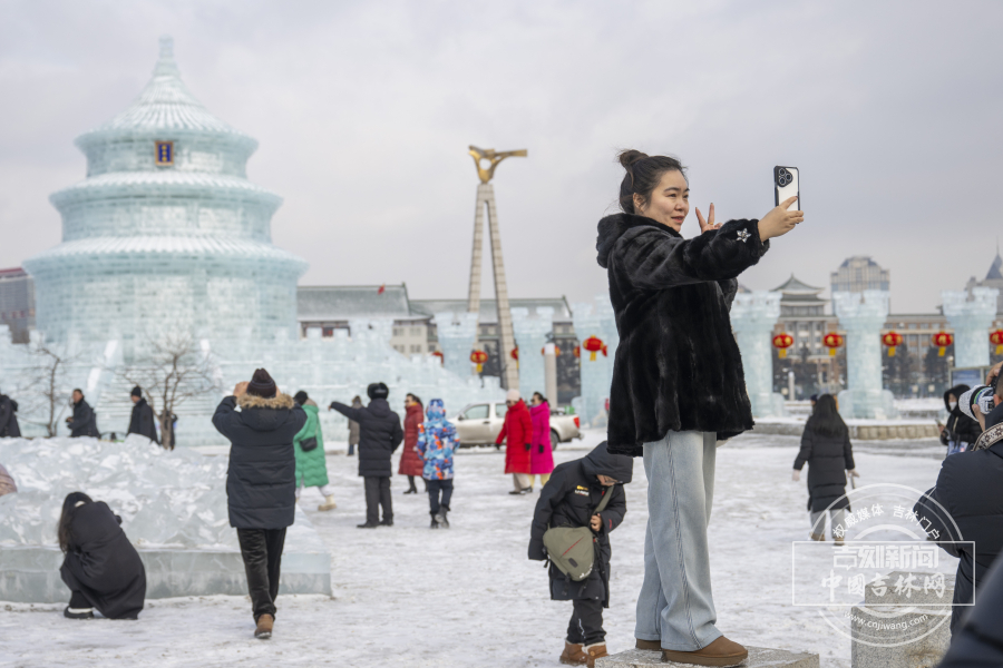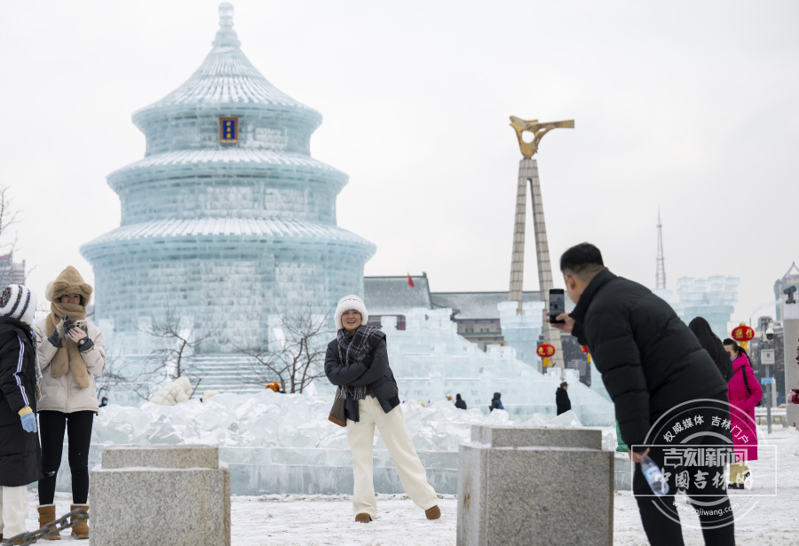 1月12日,长春文明广场21米高的冰雕祈年殿成“顶流”,飞檐斗拱精雕细琢,冰柱环绕、红灯笼点缀,清透质感吸引全国各地游客与市民争相打卡。广场上快门声不断:孩童踩碎冰比“耶”,阿姨们举冰砖合影,摄影爱好者蹲守抓拍光影瞬间。长春市民于女士带着母亲连逛三天,专门记录不同光影下的冰雕风采;外地游客则寻觅“冰拱洞探出头”的兴趣视角,定格这份北国独有的冰雪景致。
